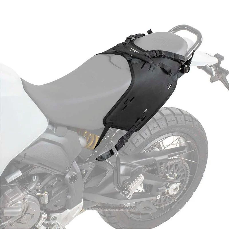 The OS-BASE is an ‘over the seat harness’ for mounting Kriega bags like the OS-6, OS-12, or OS-18 ADVENTURE PACKS with no need for metal frames. This system provides a tough, lightweight carrying solution. The fitting is modular…the harness stays on the bike and gives you the flexibility to mount a one, two, or three-pack set-up, depending on your ride. It also allows you to take the bags off quickly to go into your hotel, etc. The set-length straps make mounting quick and easy, and the custom shape provides a tight, secure fit with plenty of distance from the exhaust and fuel filler. It takes less than a minute to mount and just seconds to remove it.10-year guarantee.