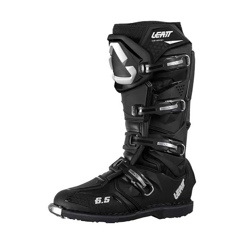 The minute you look at the Leatt 6.5 boot, you realize it has a laser-guided aim trained on the Gaerne SG-12 (and Gaerne in general). This boot is the real deal, welt sole, lateral support, sophisticated hinge, and serious protection. The 6.5 boot features a SlideLock auto-locking one way sliding closure system. This makes it easy to close the boot with gloves on and provides a great seal. Impact absorbing 3DF foam and limited flexion ensures ankle and knee protection, and the Goodyear sole construction provides great grip on and off the bike. The inner side and ankle of the boot have a bonded rubber material for outstanding bike control and the low-profile toe-box makes gear shifting easy. The Leatt 6.5 boot is complete with the LongLife spare kit, which includes spare buckles, sole and toe cap – making it a boot you buy for life.